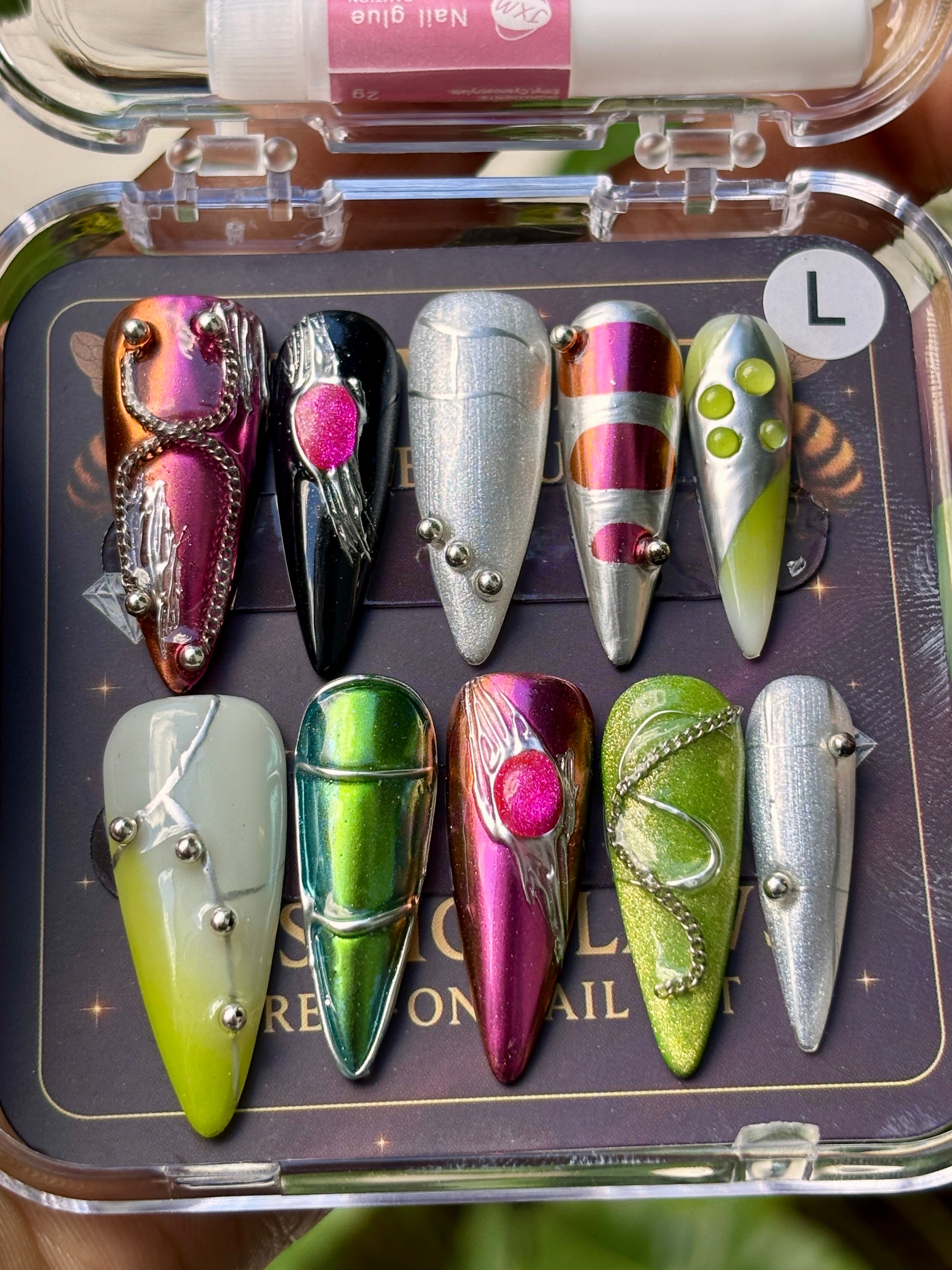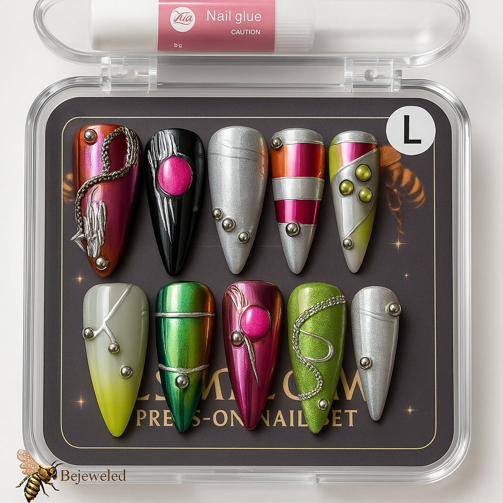 A futuristic blend of chrome metals, abstract sculpting, and cosmic color shifts. This handcrafted stiletto set mixes silver, neon accents, metallic gradients, and raised liquid-drip details for a bold, intergalactic finish. Designed for the woman who loves edgy, artistic nails that look straight off a runway.