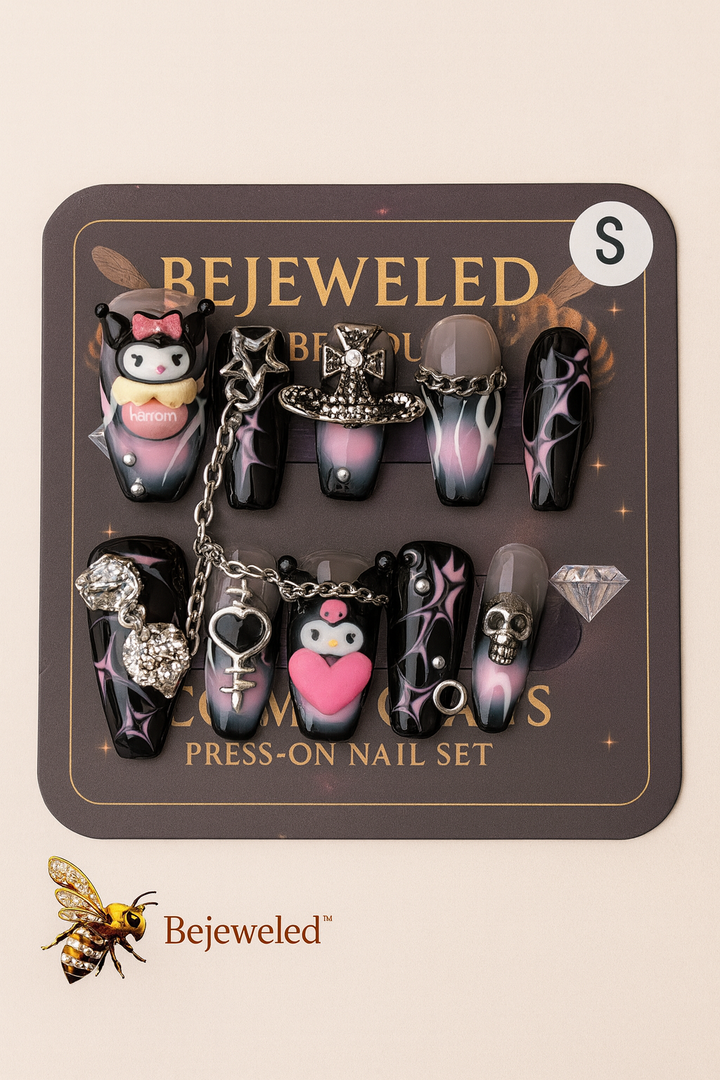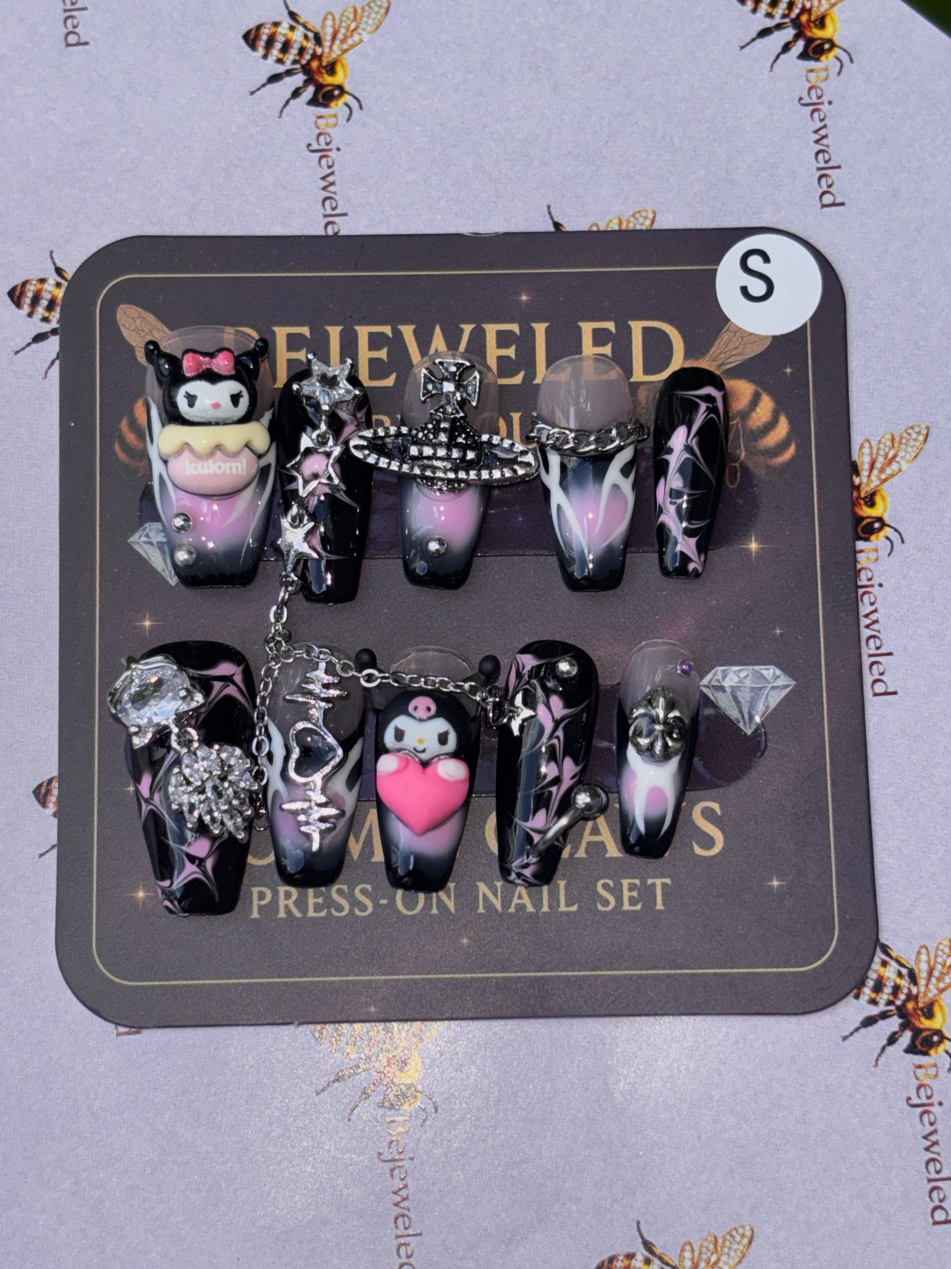 A bold galaxy-inspired press-on set for Mini Queens with a little edge. Featuring cosmic pink-and-black gradients, silver chains, stars, hearts, and adorable dark-themed characters. Perfect for the Mini Queen who loves glam with attitude.