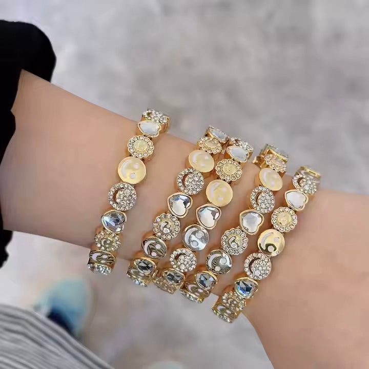Joy meets glam in this radiant stack. Featuring soft pink and warm gold tones, the Happy Luxe Stack is all about good vibes and elevated styles. This pair of two stretch bracelets decked in smiley faces, hearts, and crystals is the perfect blend of playful and polished. Made to brighten your day and your outfit, perfect for main and mini queens. Shines bright solo, illuminates when stacked! (Collect them all)
