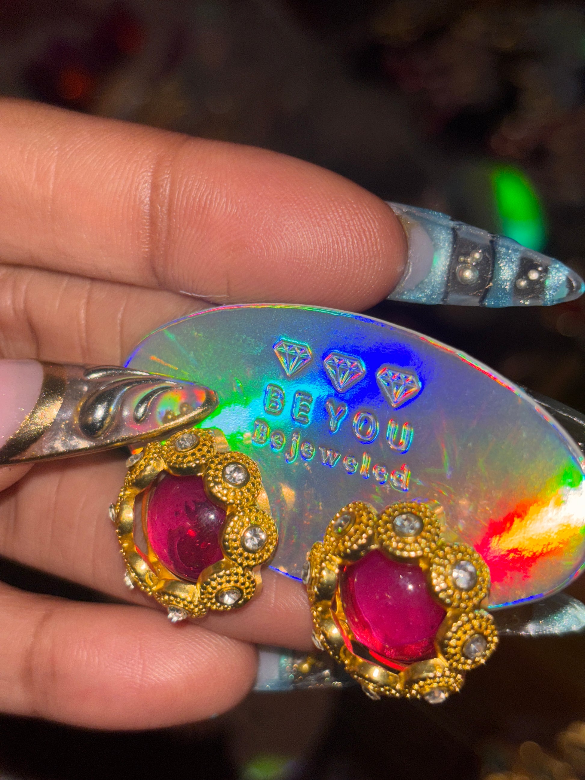 The Royal Bloom Studs are a tribute to vintage opulence- featuring a deep ruby-toned center cabochon framed by ornate gold petals, each adorned with shimmering crystal accents. These regal beauties bloom with confidence and command attention in any room.